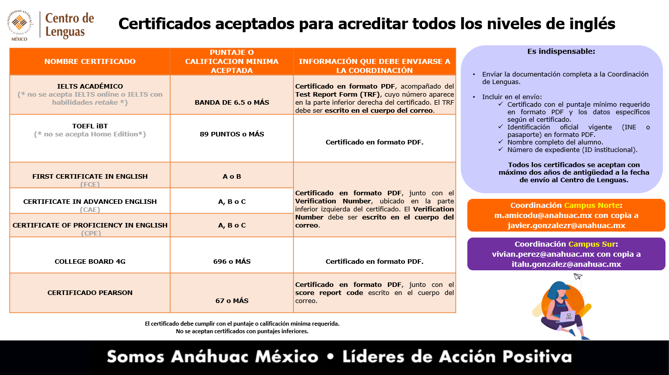No se aceptan certificados oficiales de idiomas realizados en línea o que hayan hecho uso de la opción "retake" para la acreditación de alguna de las habilidades.