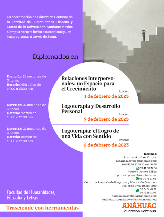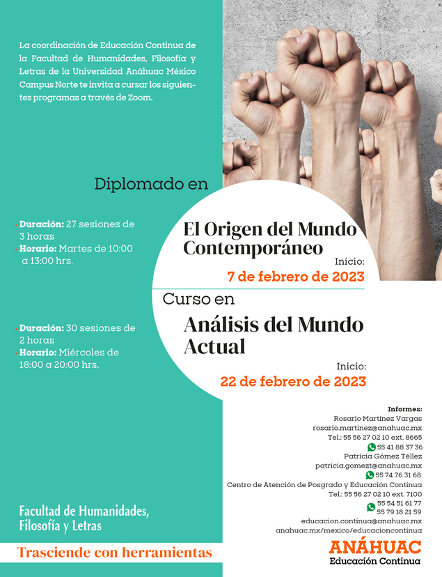 Estimados todos: tenemos el gusto de invitarte a conocer los cursos y diplomados de la Facultad de Humanidades, Filosofía y Letras de la Universidad Anáhuac. Este semestre la mayoría se llevarán a cabo por videoconferencia zoom. Solo tendremos dos cursos híbridos (podrán asistir o cursar por zoom) Puedes entrar sin compromiso a la primera sesión para conocerlo; son por la mañana, no requieres estudios previos ni hay exámenes. Si quieres el programa completo y costo por favor solicítalo por mail o WhatsApp. Por favor ponte en contacto con nosotros para que recibas la invitación y así puedas entrar a la sesión de zoom.