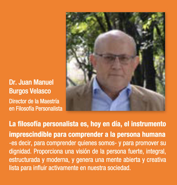 La Maestría en Filosofía Personalista ofrece una formación sobre los fundamentos y las líneas de pensamiento de las corrientes y autores principales, como son: K. Wojtyla, E. Mounier, J. Maritain, R. Guardini, D. Von Hildebrand, J. Marías, M. Buber, E. Lévinas, Edith Stein, Juan Manuel Burgos, etc.; como de sus aplicaciones a la realidad cultural y social: antropología sexuada, estética, psicología, educación, estructura social y política, etc. El conjunto de esta formación posee una potencialidad enorme tanto para la consolidación de una visión moderna y estructurada de la persona, esencial para la comprensión y constitución de la propia identidad, como para la formación de personas con una visión intelectual responsable ante los numerosos retos que afectan, hoy en día, al ser humano.